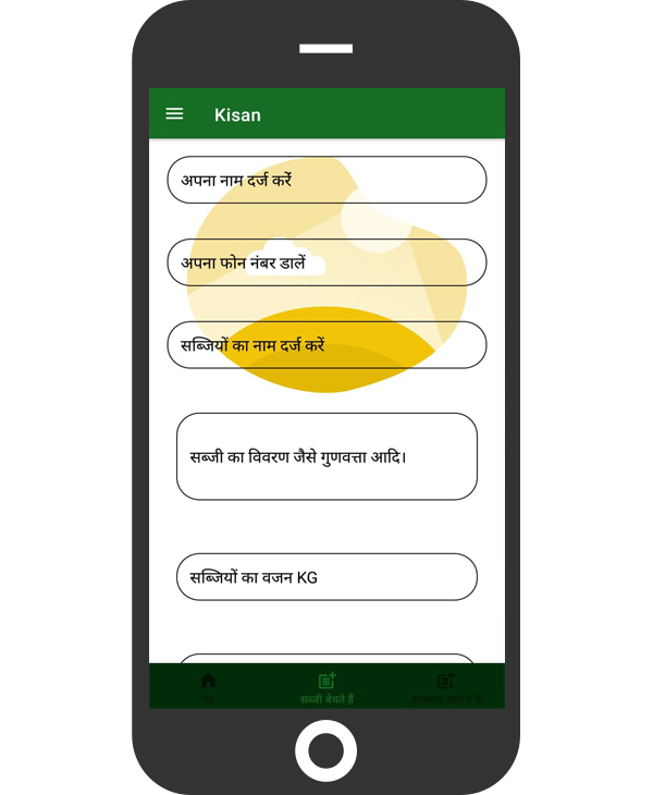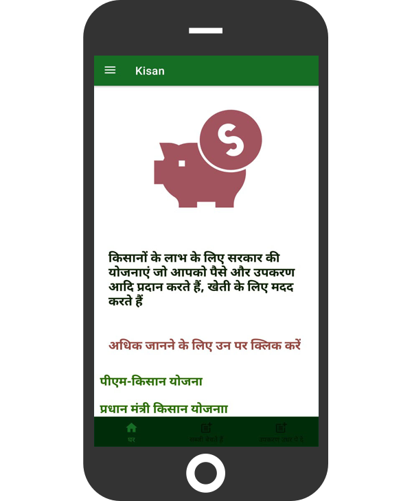 On average, farmers around the world account for 70% of all water that is consumed annually. Of that 70% used by farmers, 40% is lost to the environment due to poor irrigation systems, evaporation, and overall poor water management systems excessive use of water results in lower yields and adverse environmental effects such as soil salinity and waterlogging. The main reasons for the poor yields are improper irrigation management and waterlogging. [2] According to the World Resources Institute, an environmental think tank, inside the 1.3 billion tons of food wasted every year worldwide is 45 trillion gallons of water. This represents a staggering 24 percent of all water used for whole agriculture. [3] And farmers are also unable to sell their crops direct to the customers they sell it to the middle Men At very low cost, which causes them to have low profitability and capital expenditure on crops, cause they don't have reached to the actual consumer market. Their problem of not knowing the best techniques and methods of farming and not having the latest machines and equipment. It is because they are uneducated and are not in contact with those well-informed about these, has also been a big huddle for our agriculture industry. [1] Over 20% of our farmers live below the poverty line. [4].This App removes middle man and connects farmer to consumer directly, That means two things: one, Farmer gets highest profit possible without going out to sell, and two: our consumers get the highest quality crops directly from farms at an affordable cost, Which can increase farmers profit as high as 500% on every trade he does, By doing they can most probably get rid of their poverty, provided that adequate amount of farmers and consumers are using the app. A whole IoT (Internet of things) based mechanism will be provided to farmer to get all physical measures on “KISAN APP”, For Instance sensors like Soil Moisture Senor, Humidity Senor, Smoke detector etc., Will be added to the mechanism, On based of this data collected from the farmers field app will give parameter like time for which we have to irrigate the field, amount of water etc. Through this farmers will be actually able to save water and grow more crops, and this will also prevent their field from waterlogging and salinity. This app has a section by title “KAM KI BAAT”, which educates farmers for new farming techniques and tells them about farmers helping schemes imposed by government, So that they can take advantage of these schemes and new farming techniques to grow crops.